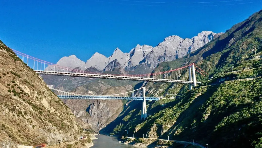 并行的丽香高速金沙江特大桥和丽香铁路金沙江特大桥。(丽江融媒记者 廖浚宏 摄)