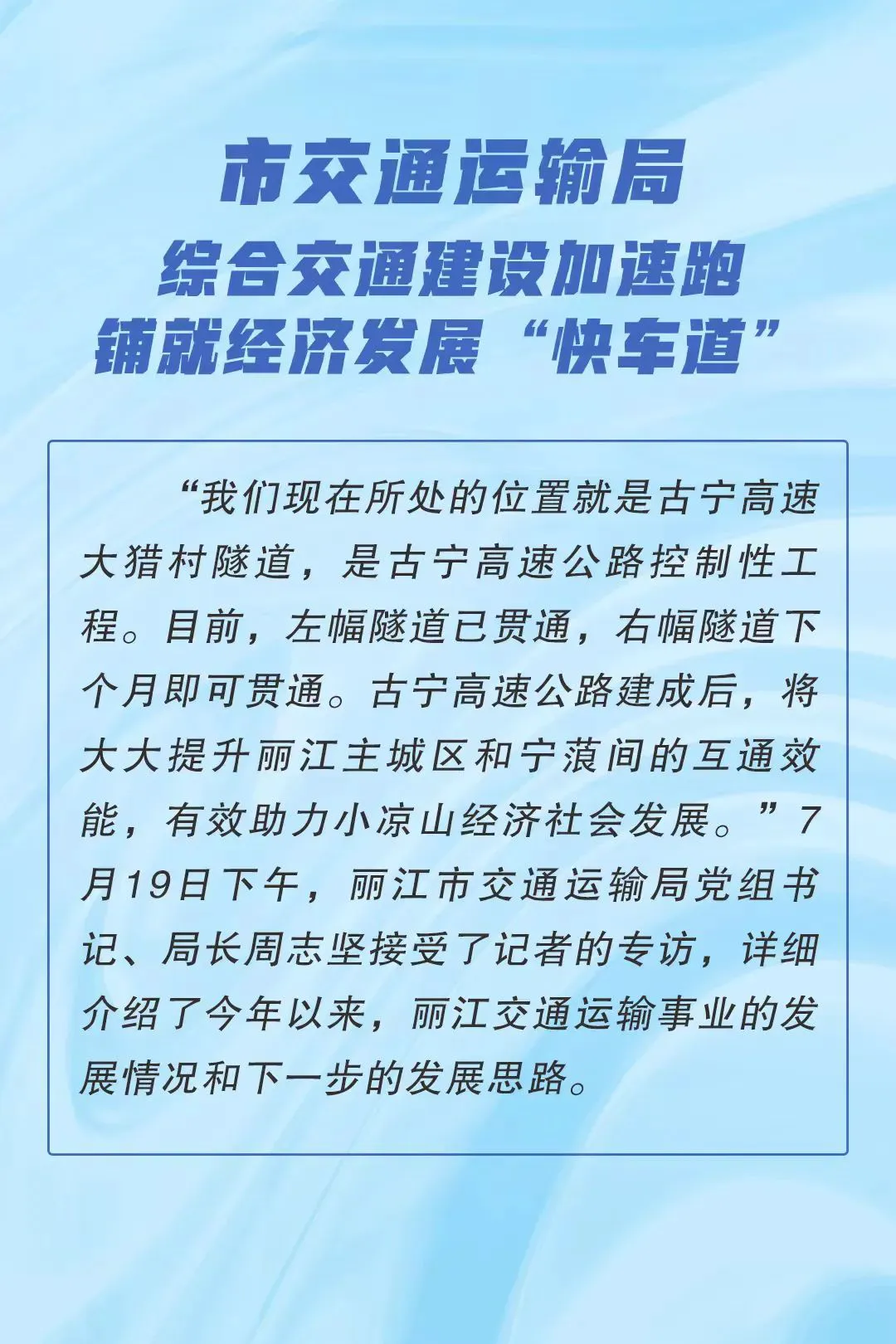 周志坚表示,根据市委、市政府就持续实施综合交通基础设施补短板所作的安排部署,今年下半年,丽江市交通运输局将坚持“盯住问题不放松、抓住节点不松劲、优化时序抢进度”的原则,重点抓好六项工作: