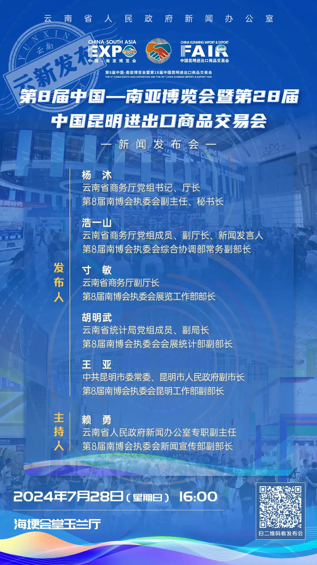 7月28日下午,云南省人民政府新闻办公室在云南海埂会堂召开第8届中国—南亚博览会暨第28届中国昆明进出口商品交易会新闻发布会,介绍有关情况并回答记者提问。
