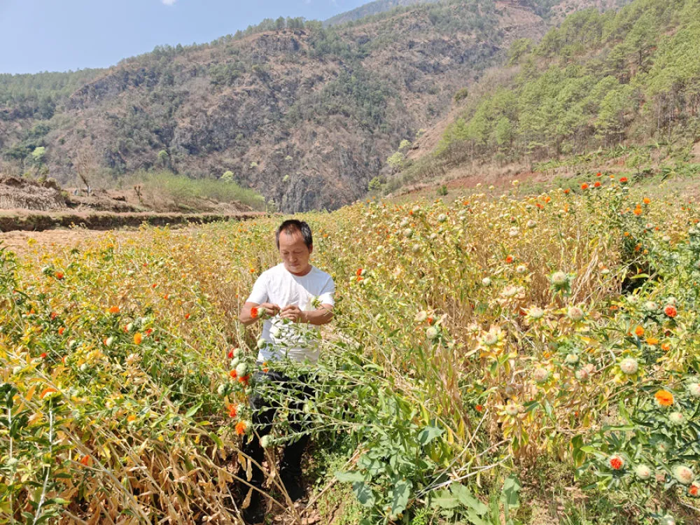 过去,江边村村民以传统作物种植为主,收益有限。如今,江边村开始推广红花种植,并逐步形成了规模。“红花浑身都是宝,不仅花可以卖钱,连秆子都能变废为宝。”江边村烟叶片区管理员骆金贵介绍。
