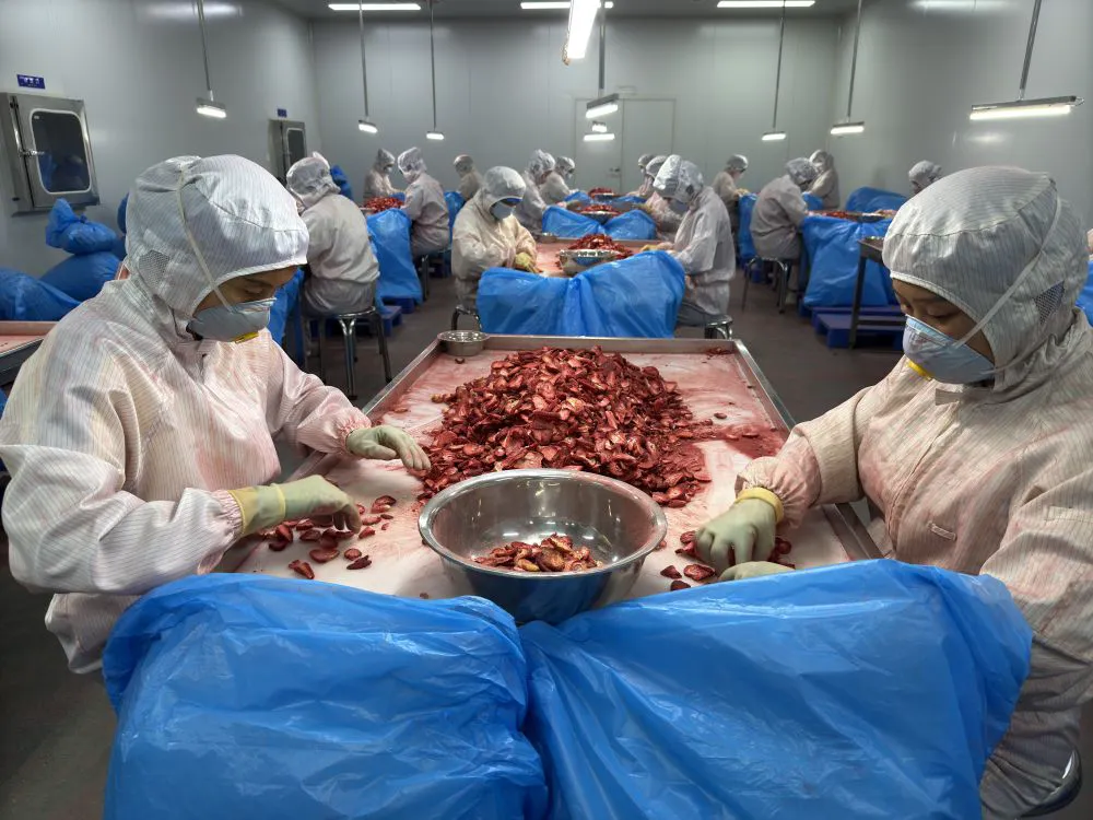 草莓鲜果经过清洗、切片、冻干等工序后,最终变成色泽鲜艳、口感酥脆的草莓冻干,这是晶南食品有限公司的主推产品之一。2019年,晶南食品有限公司抓住绿色发展机遇,通过技术创新和产业升级,实现了从高污染、高能耗的煤矿行业向绿色、环保食品加工行业的华丽转身。目前,公司产品主要出口至欧美地区,年总产值约4000万元,年产量稳定在300多吨。晶南食品的成功转型,为企业带来了新的发展机遇,也为华坪县的产业转型升级和绿色发展树立了典范。