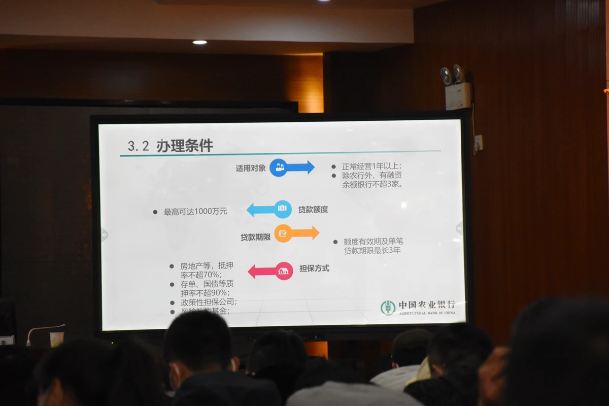 在对接会上,相关金融机构负责人分别向经营户讲解了金融支持政策与贷款担保政策,工商银行丽江市分行、农业银行丽江市分行等多家银行依次介绍金融产品。
