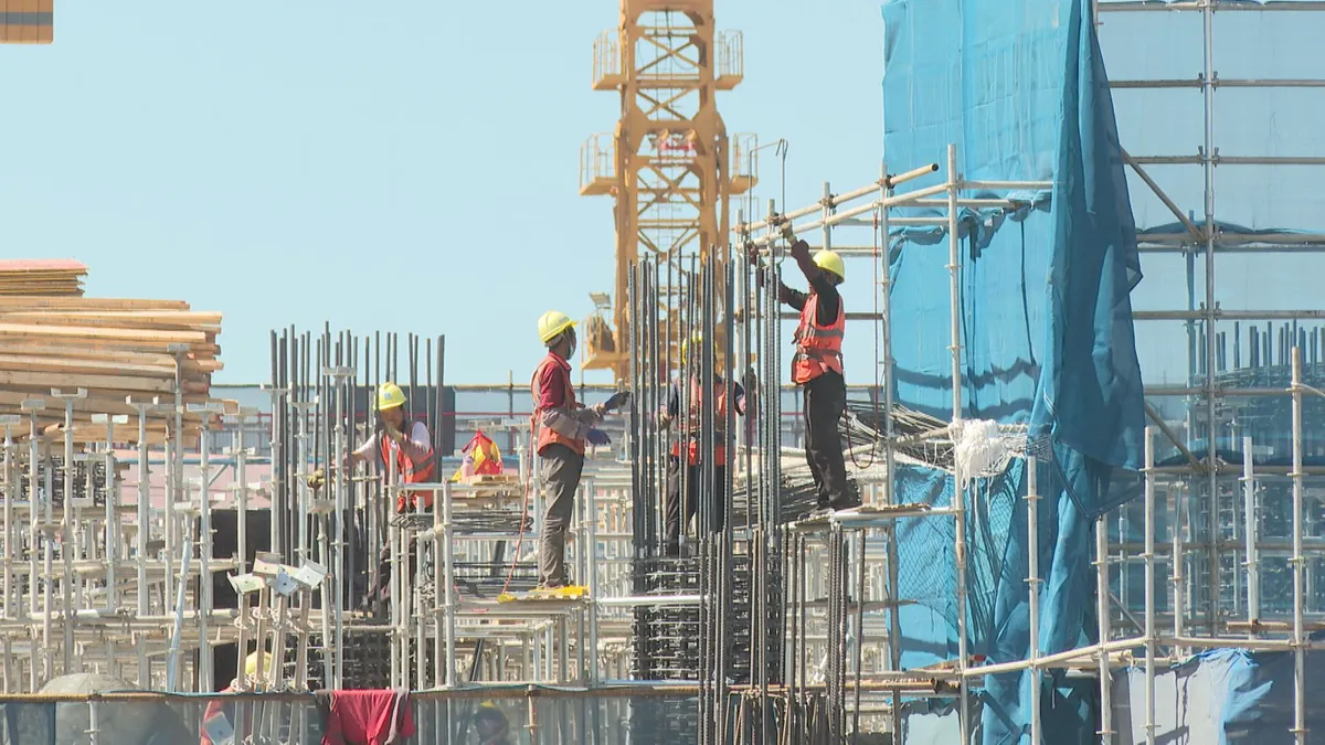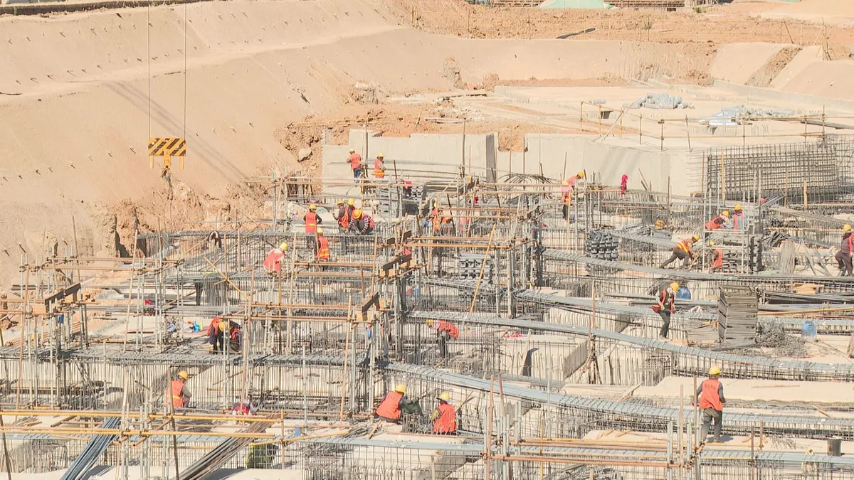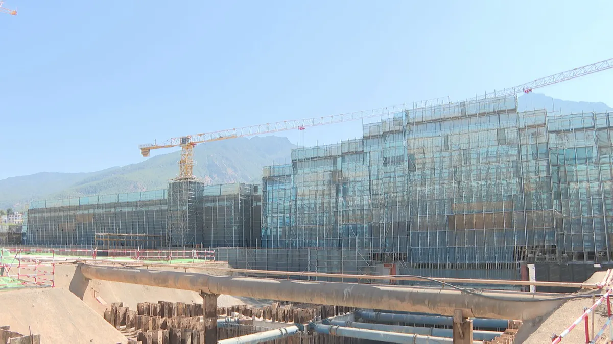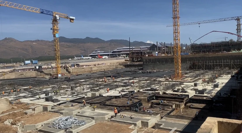 近日,记者来到古城区七河镇探访丽江机场三期改扩建项目进展情况:现场施工机械轰鸣、塔吊有序运转,在航站楼中心区,工人正在进行基础底板的施工,钢筋绑扎、模板支护、混凝土浇灌,一片热火朝天的景象。