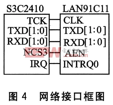 解码芯片TVP5150的AIPIA模拟信号输入口与摄像头的信号输出端相连,并向压缩编码芯片AT2042传送视频信号。由于TVP5150分场同步脉冲和行同步脉冲,分别对应的输出端为VSYNC和HSYNC,AT2042根据与之相连的VSYNCIN和HSYNCIN信号线来实现图像的场同步和行同步操作;AT2042的视频信号输入数据线VIN[7:0]与TVP5150的输出端YOUT[7:0]相连。AT2042将接收到的数据流传送到压缩编码单元,压缩编码后的视频数据存储到外部SDRAM中,同时通过片内的SDRAM控制器来实现对SDRAM的访问,并将数据流通过HPI总线发送到S3C2410以便通过网络传输到PC监控端,用于实现远程的实时监控。2.2 网络传输部分 主控制芯片S3C2410通过地址、数据、控制线以及片选信号线对网络芯片LAN91C11进行控制和通信。主芯片发送信号时首先置发送使能信号,数据发送信号端TXD0~TXD1与LAN91C11的TXD0~TXD1引脚连接,作为数据的发送通道以S3C2410的时钟信号TCK发送数据。数据接收端RXD0~RXD1与LAN91C11的RXD0~RXD1引脚对应连接,为数据接收通道。 LAN91C11由S3C2410选通信号线AEN来选通,通过对LAN91C11一系列寄存器的设置,可以实现视频流的网络传输。LAN91C11的INTRQ0端用来产生中断信号。以太网控制芯片通过DMA通道进行数据的传输。首先设置好传输控制和传输地址寄存器的参数,依次从指定的数据存储区域读取数据,送入内部发送缓冲器中,用MAC对数据进行封装发送,并同时记录已发送完的字节数,等到整个数据块发送完毕。一组数据发送完后请求DMA中断,由S3C2410进行处理。网络接口框图如图4所示。
