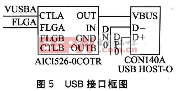 2.3 本地存储部分 存储接口选用S3C2410自身的LJSB接口功能,该接口可以实现USB1.1协议。随着大容量、小体积U盘的问世,更多的用户都选择使用该存储介质。 当今的USB技术使得各种能够自行识别的外部设备与设备终端连接,并自行装载驱动程序以运行新的装置。而一般即插即用装置,需要有电源的USB接口进行数据传输并提供电源。当发生短路或连接了受损设备时,如受损的电缆或连接头插入USB接口时,必须对USB集线器及主机装置提供有效保护。USB接口的设计电路如图5所示。