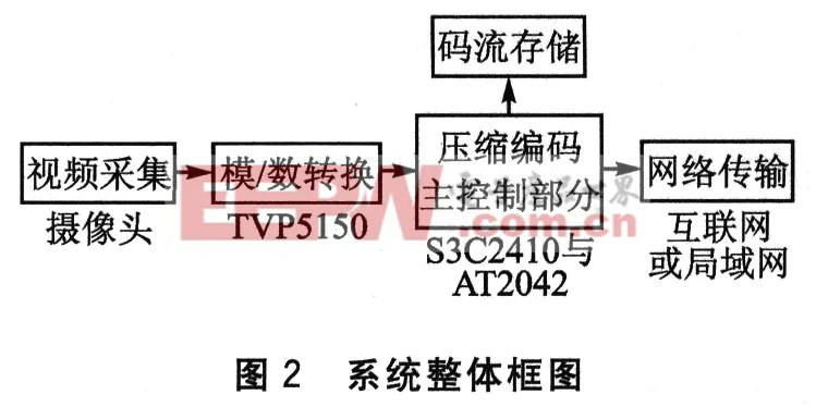 2 系统硬件设计硬件系统主要由视频编解码部分、网络传输部分、本地存储部分、其他外设和接口部分组成,如图2所示。包括S3C2410和AT2042、NAND Flash和SDRAM、数/模转换芯片TVP5150和模/数转换芯片SAA7112以及网卡芯片LAN91C11。接口包括USB接口、IDE接口、网卡接口、电源接口等。