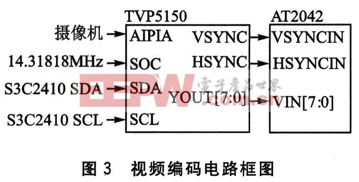 2.1 视频编解码部分视频编解码电路主要包括模/数转换电路和视频压缩/解压芯片AT2042。其中,AT2042主要负责对经模/数转换芯片TVP5150转换来的数字视频数据进行硬件压缩。压缩编码过程中,摄像头采集的模拟视频信号先经过TVP5150进行前端处理,产生符合AT2042视频接口标准的数字视频信号。在S3C2410的控制下,该数字视频数据由压缩/解压芯片AT2042进行硬件压缩编码,产生的编码数据流通过芯片内部集成的Mux FIFO接口输出。网络视频服务器的解压缩编码是压缩编码的逆过程,需要解压的数据流通过AT2042内部集成的Demux FIFO接口输入,解压缩编码电路基本原理类似于压缩编码,这里不再赘述。视频编码电路框图如图3所示。TVP5150是TI公司生产的一款电视信号解码专用芯片。它对输入的模拟信号进行A/D转换,TVP5105支持NTSC/PAL/SECAM三种制式,实现模拟视频信号转换为数字并行信号ITU-R BT.601或ITU-RBT.656码流格式。由于AT2042视频接口满足ITU.RBT656标准,故TVP5150输出配置为8位的YUV422格式。
