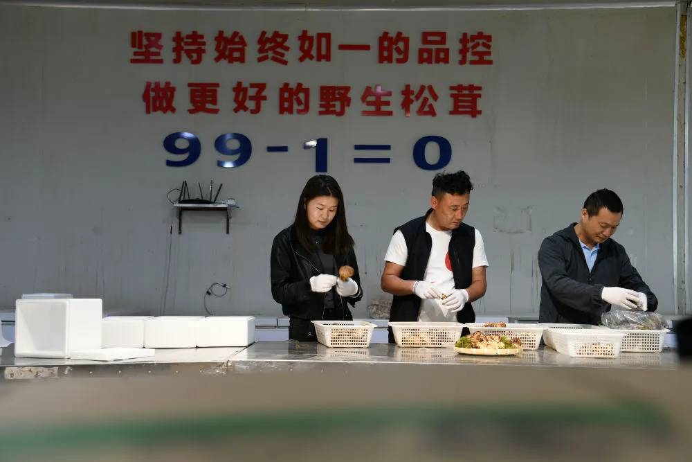 丽江市松茸交易中心工作人员在打包分拣松茸。(丽江融媒记者 赵庆祖 摄)