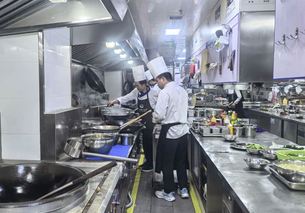 金生丽水餐饮管理有限公司后厨内,厨师们正在出餐。(丽江融媒记者 秦文静 摄)