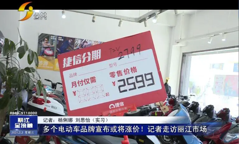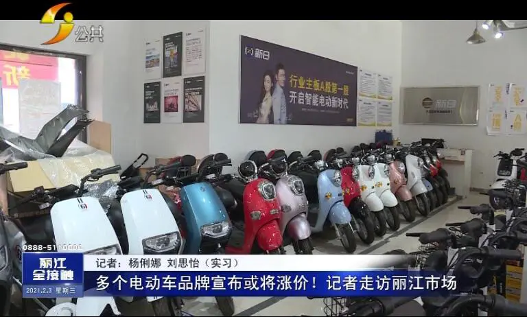 根据央视新闻客户端报道,多个电动车品牌日前密集发布通知,表示旗下产品将全面涨价,在2021年开年,电动车行业就将迎来新一轮涨价潮的冲击。那么,目前丽江市场上的电动车行情如何?有没有涨价呢?让我们跟随记者一起走访市场去问一问。