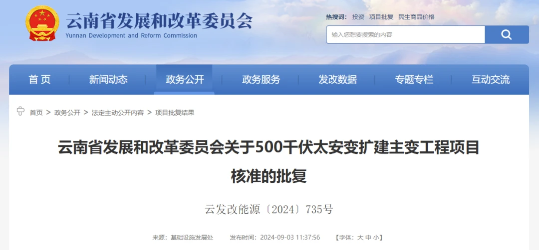 《丽江市发展和改革委员会关于500kV太安变扩建主变工程项目核准的请示》(丽发改请〔2024〕194号)、《云南电网有限责任公司关于500kV太安变扩建主变工程项目核准的请示》(云电规划〔2024〕354号)及有关材料收悉。根据《国务院关于发布政府核准的投资项目目录(2016年本)的通知》(国发〔2016〕72号)、《企业投资项目核准和备案管理办法》(国家发展改革委令2023年第1号修订)、《云南省人民政府关于发布政府核准的投资项目目录(云南省2016年本)的通知》(云政发〔2017〕17号)、《云南省人民政府关于印发云南省企业投资项目核准和备案实施办法的通知》(云政规〔2023〕2号),结合省能源局审核意见,经研究,现就500千伏太安变扩建主变工程项目(项目代码:2407-530000-04-01-946514)核准事项批复如下: