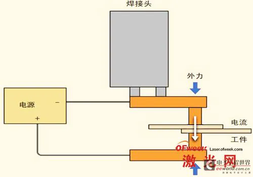 施加力量下的振动作用在焊接界面上造成不均匀表面的塑性变形,从而导致形成高度密切的接触和金属原子扩散。由扩散形成连接,连接处没有熔化。部件产生一些变形或变薄,但是可以正常控制。通过焊头的摩擦来维持焊头与部件之间的接触,通过焊头上的压花纹加强摩擦。 超声波焊接特别适合于导电部件的薄板焊接,其中包括铝和铜。超声波工艺在微焊接中存在一些缺点。由于需要将力量传输到部件上,因此,连接的两侧要求产生机械接触。另外,焊头是一种要求检验和更换的损耗品。连接的几何形状在一定程度上仅限制于搭接焊接。最后,受焊头驱动影响,焊接周期速度会降低生产速度。 电阻焊接:工艺灵活,但是不适合于机械精密部件。 当电流通过部件时,电阻焊(图2)使用焊接界面的高电阻产生热量。电流产生于工件的相同侧或相反侧接触部件的电极,形成回路。在部件上施加一些力量,以确保电气接触。