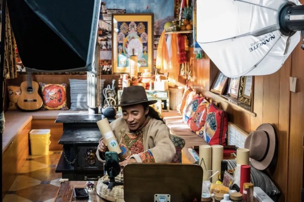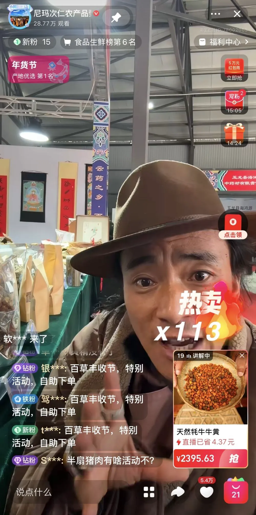 依托家乡秀丽的自然风光,质朴的生活场景,尼玛次仁敏锐捕捉到了这个“天赐”的流量密码,将直播间搬进了田野里、山林间、火塘边,以及日常的乡村生活中……开辟了一条独具特色的直播带货新赛道。他避开了抖音、小红书这类热门直播平台,反而选择淘宝点淘直播平台,0粉丝起号,打开了一片天地。