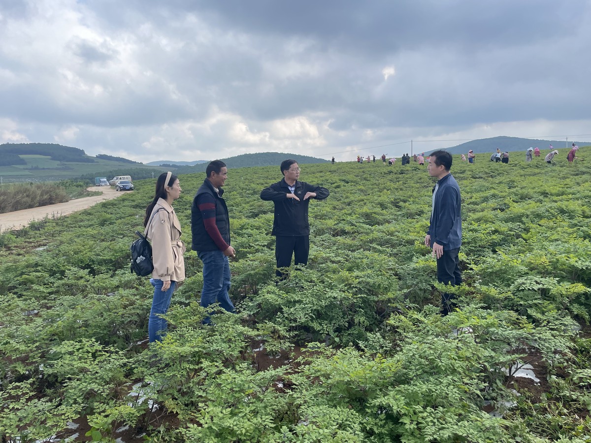 彭识(右二)在玉龙县太安乡云当归种植基地与种植户交流。 (丽江融媒记者 王璠 摄)