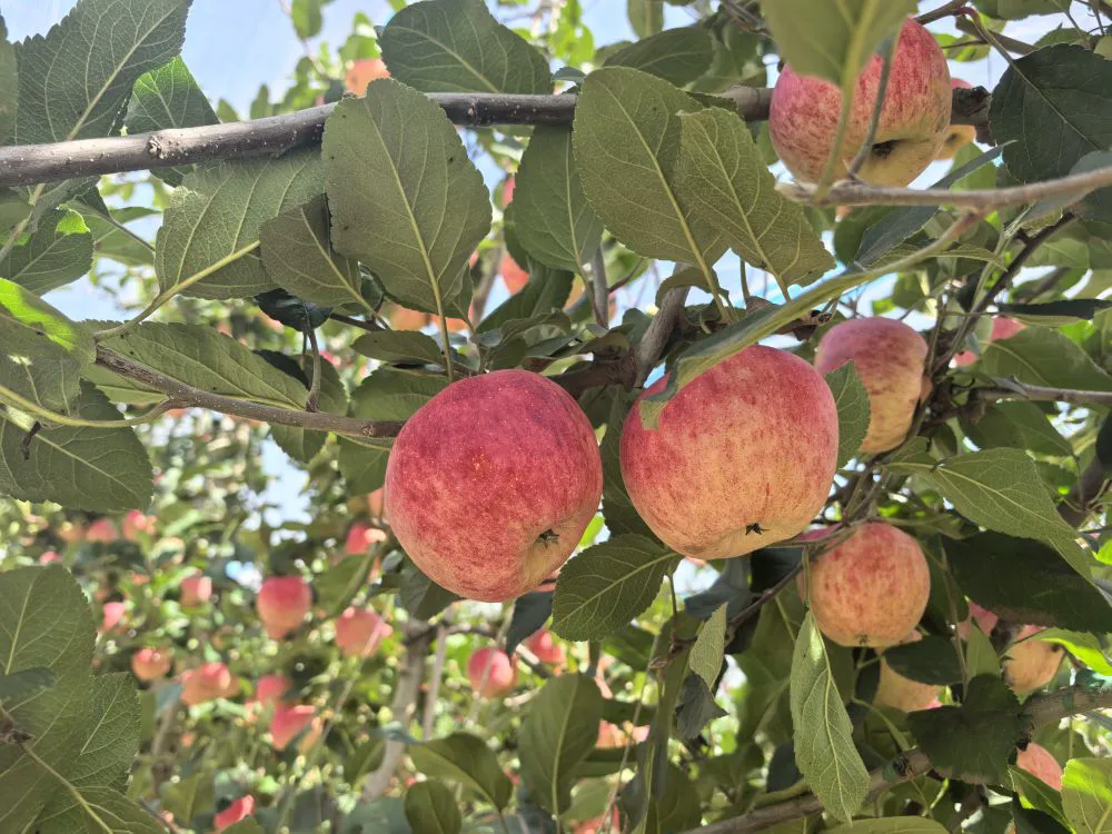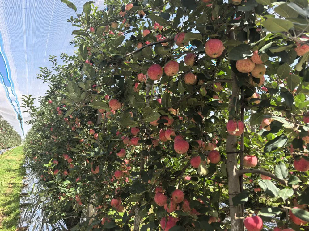 短短几年,果园产量直线上升,不仅得益于当地优异的自然条件,更离不开专业团队的技术支撑。据悉,公司组建了一支技术研发团队,致力于苹果种植模式的优化研究。目前,果园采用 “矮砧密植” 种植模式,运用了先进的滴灌系统及机械化作业方式,最大程度满足果树通风、透光需求,让每一颗果实都能获得最佳光照,充分吸收养分。依托这项技术开展水肥管理,1名技术员1天即可完成300亩果园的精准施肥与灌溉,大幅降低了人工成本。