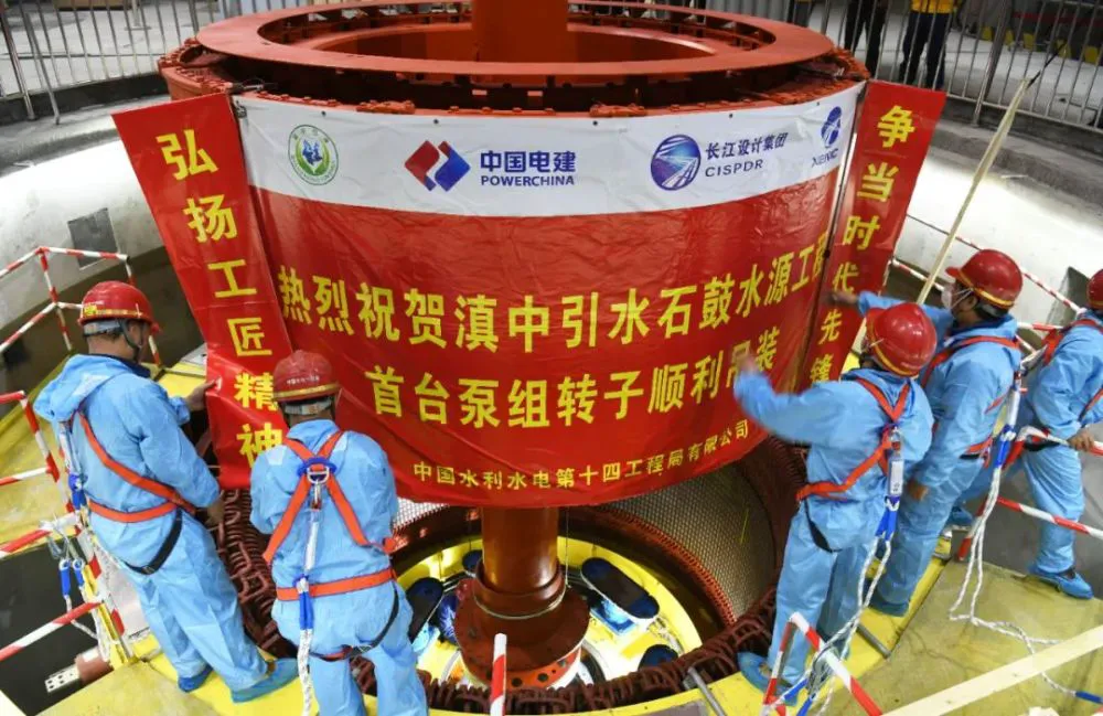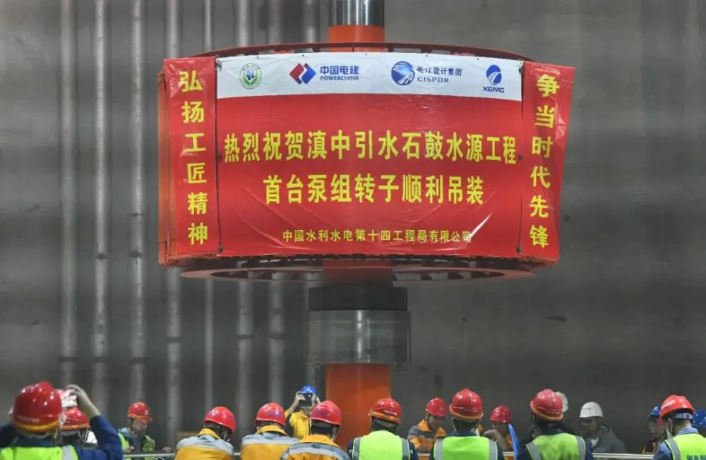 11月2日,伴随着指挥下落的指令哨音,世界最大水泵机组首台机组转子在丽江石鼓顺利吊装就位,该机组正式进入总装阶段。此次转子的吊装成功,标志着滇中引水石鼓水源工程建设实现了关键节点目标,为确保完成今年年底首台水泵机组总装任务,以及后续机组调试运行工作奠定了坚实的基础。