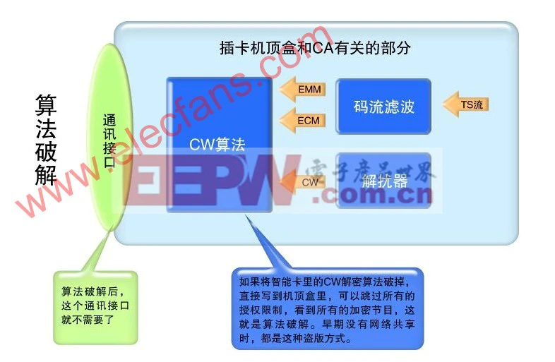图二是一种传统的CA算法破解方式,是采用物理方法将智能卡内部的算法和密钥读出来,再复制盗版卡。因为花费比较大,再加上现在的CW网络共享成本很低,一般情况下就不再采取这种方式破解了。但是,在互联网不发达的时候,第一代CA几乎全部是用这种方式被破解的,这是一种非常彻底的破解,解决的唯一办法就是换卡。