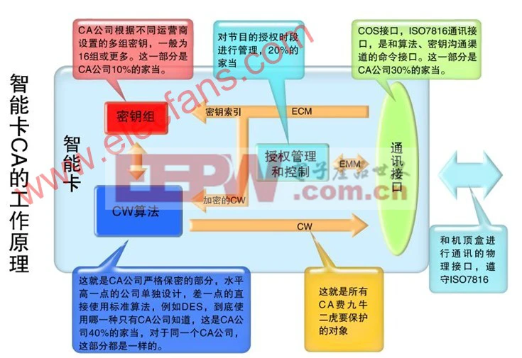 首先要了解一下CA的结构,见图一的智能卡,这里面保存了CA公司的全部家当。并注明了各部分大体的重要性分量。