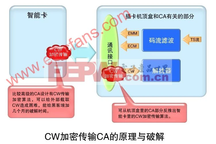 数字电视CA的各个部分是紧密连接在一起的,一旦一部分出问题,其他也会受牵连。 CA的破解都是从局部的破解开始,直到最后彻底被攻破。根据从以往被破解的CA过程,分别解释如下: