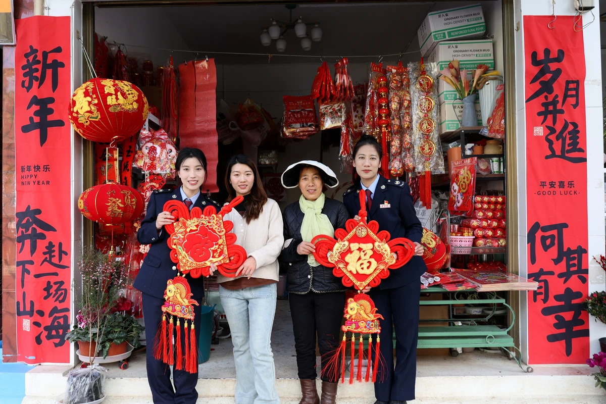 春节前,国家税务总局宁蒗彝族自治县税务局干部走进年货街,走访年货销售企业和个体工商户,了解备货、发票需求等情况,并送上新春祝福。(和会林/摄)