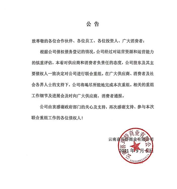 曾于8月23日忽然宣布关店的喜玛特,9月5日在其微信公众号发布公告,表示经慎重评估,公司股东及其主要债权人一致决定对公司进行联合重组。