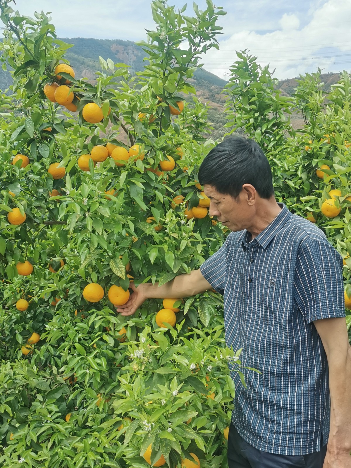 光明村委会副主任子津才在察看沃柑长势。 (本报记者 何世辉 摄)
