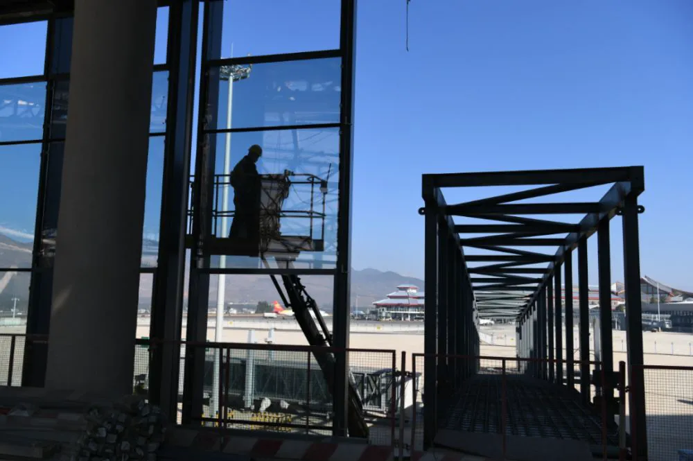 丽江机场三期改扩建工程加快推进。(丽江融媒记者 赵庆祖 摄)丽江机场三期改扩建项目工程部施工员封松说,目前航站楼主体结构已完成,航站楼钢结构完成100%,二次结构已完成85% ,航站楼幕墙施工整体完成75% ,航站楼金属屋面整体完成70%,全面进入精装修阶段。春节前还会增加相应的建设力量,努力完成任务目标,给春节交上一份圆满的答卷。据中建三局丽江机场三期改扩建项目部行政总监尹瑞峰介绍,进场以来,项目团队周密安排施工部署,高效统筹各项资源,全力以赴推进工程建设跑出新速度、迈向新高度。“这几天,有近900名建设者坚守施工一线,抓进度、抓质量、抓安全,确保工程顺利推进。”尹瑞峰说,丽江机场T3航站楼钢结构为大跨度空间桁架+网架结构体系,项目应用BIM技术,通过模型推演,过程中克服结构复杂、杆件焊接量大、安装精度高、空间狭小等困难,将“精、细、严、实”要求贯穿到施工各环节,先后完成数万根杆件焊接和近万个焊接球焊接,最终精准提升,实现了T3航站楼屋盖钢结构顺利封顶。
