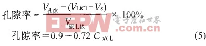 反应产物LiCI和S的形成发生在电解液/碳包界面,且不溶解于SOCl2,所以会沉积填充碳包孑L隙,假设LiCI和s完全均匀填充碳电极孑L隙中,那么通过碳电极初始孔体积1.126 1 cm,减去生成的LiCI和s的体积可以得到碳电极内有效的孑L隙体积,与碳电极总体积相比可以得到碳电极孑L隙率与放电容量之间的关系: