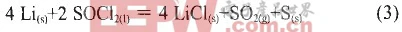 由反应式(3)和式(4)可以得到如表2所示的放电0.8时产物LiCl、S和s02的生成的量。