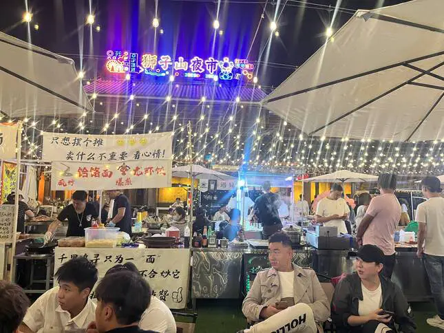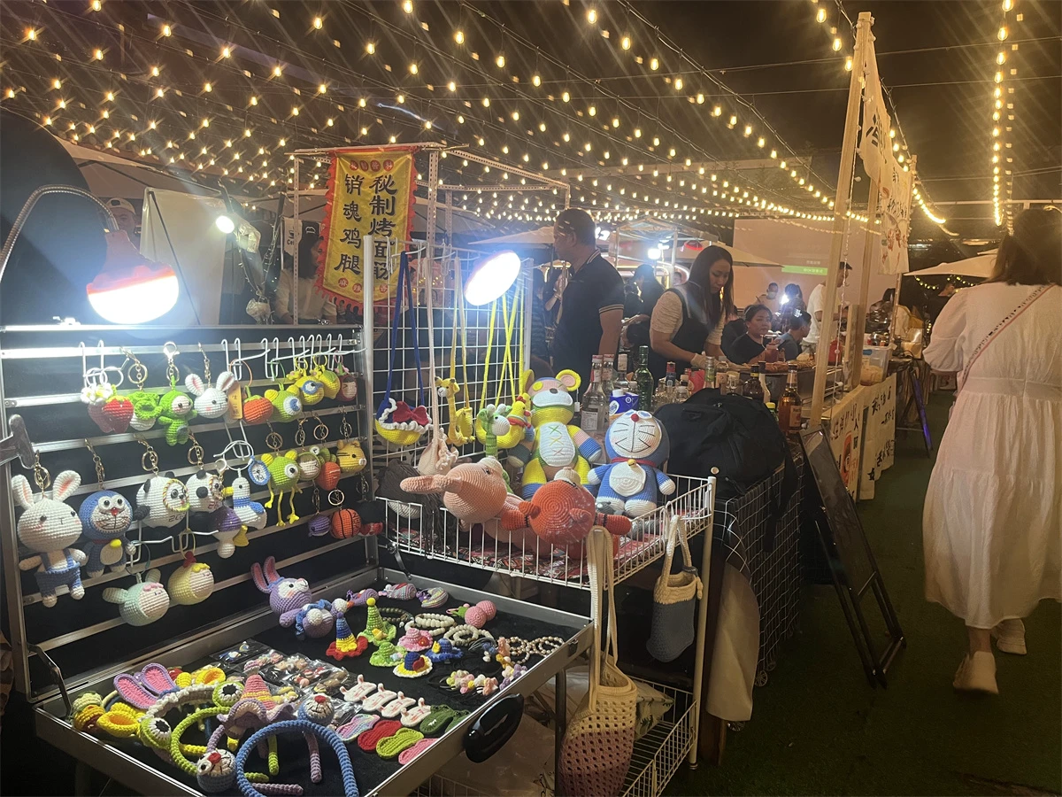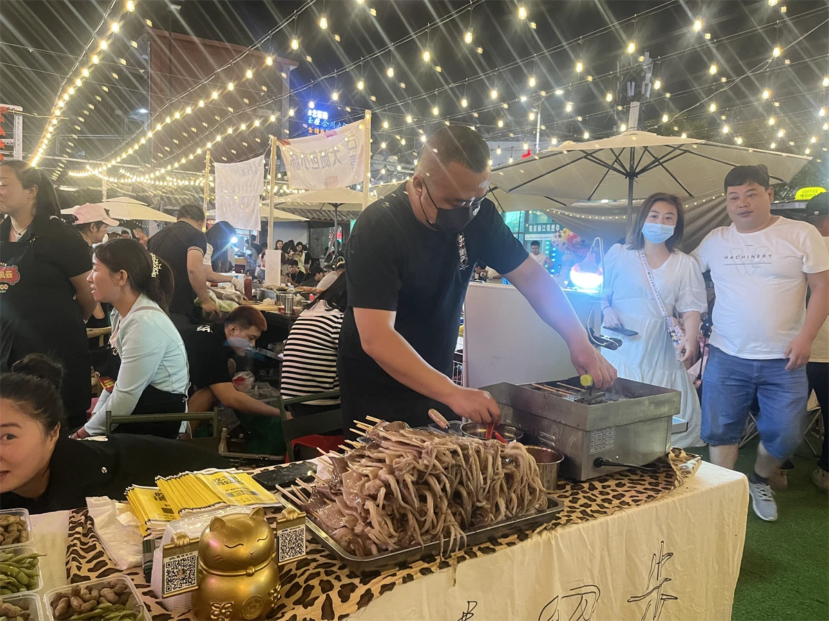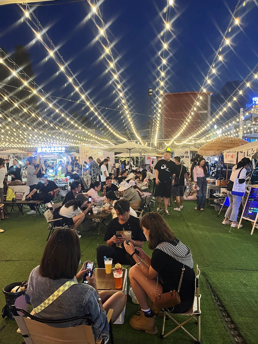灯光下,整齐划一的摊位,热闹火爆的生意,熙熙攘攘的人群,食客们喝着啤酒、品尝着喜欢的美食;女孩们挑选着衣服饰品;小朋友则聚在一起玩着各类游戏……