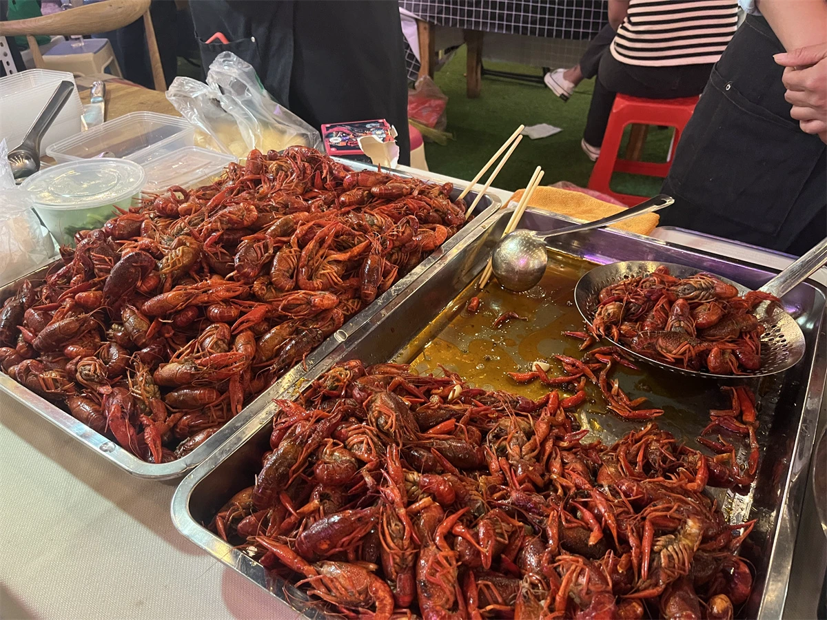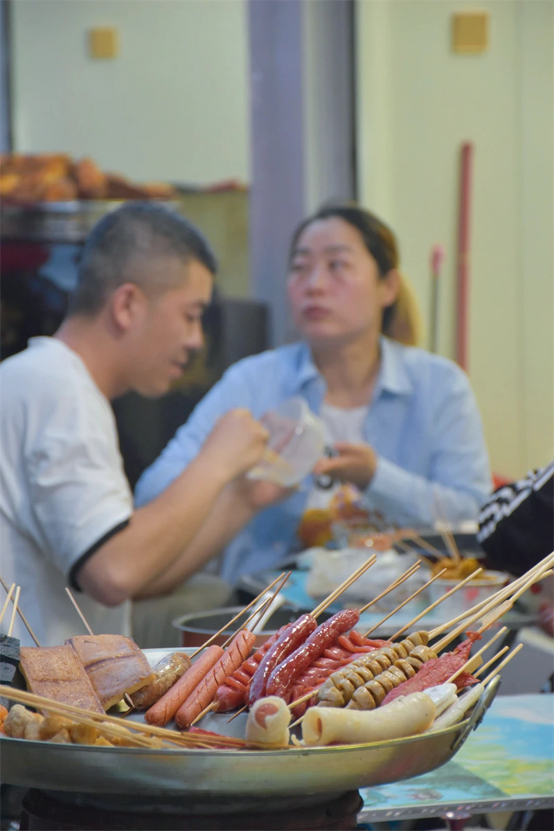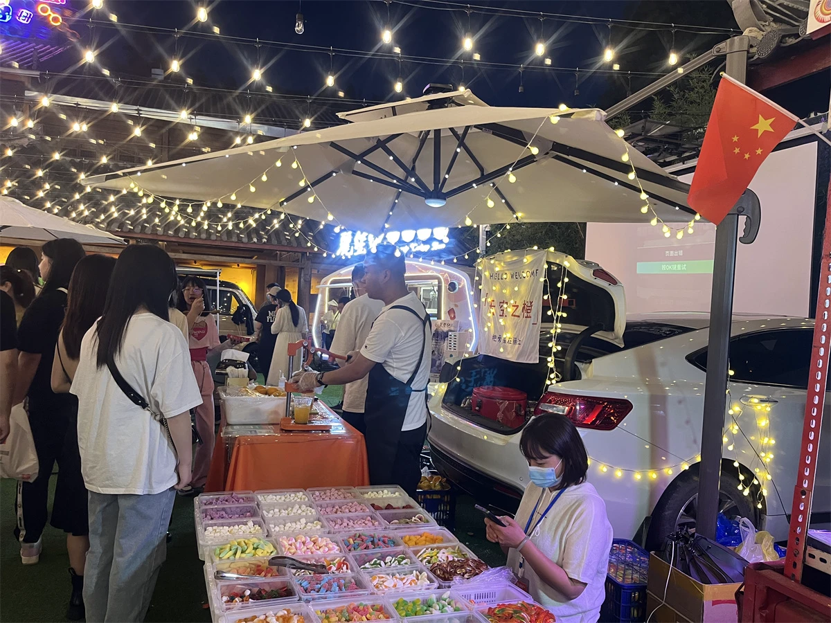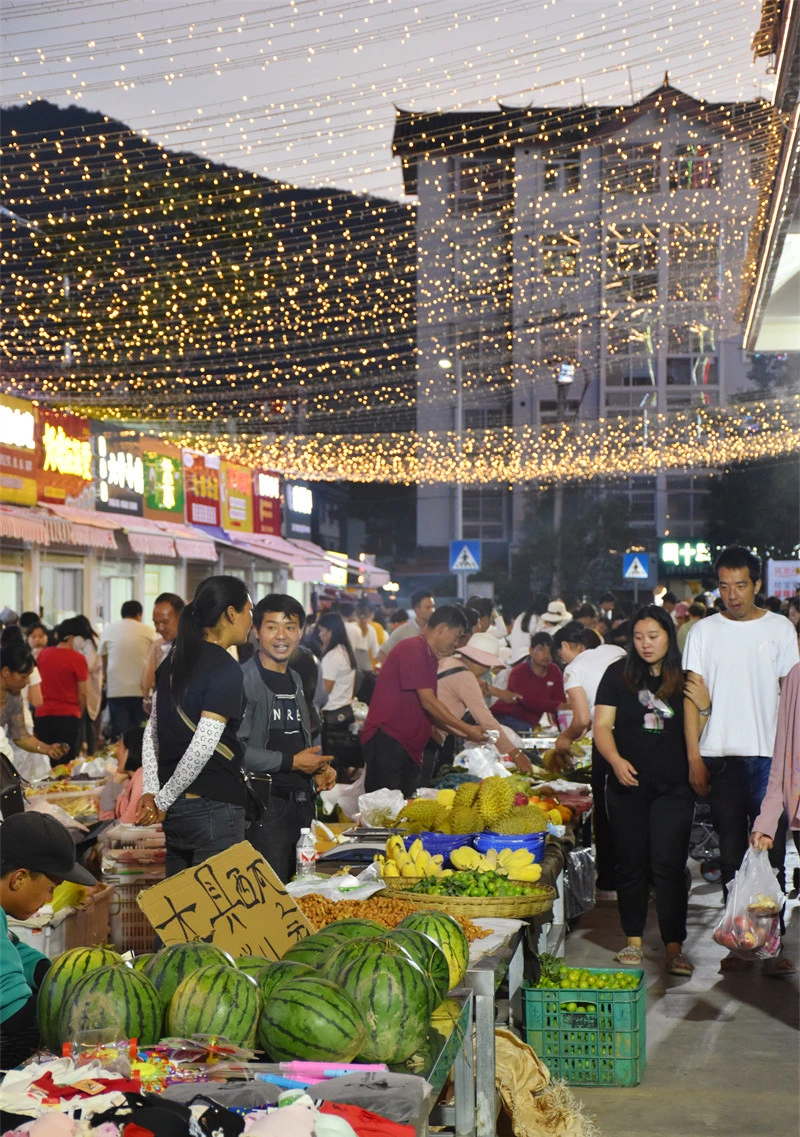 灯光下,整齐划一的摊位,热闹火爆的生意,熙熙攘攘的人群,食客们喝着啤酒、品尝着喜欢的美食;女孩们挑选着衣服饰品;小朋友则聚在一起玩着各类游戏……