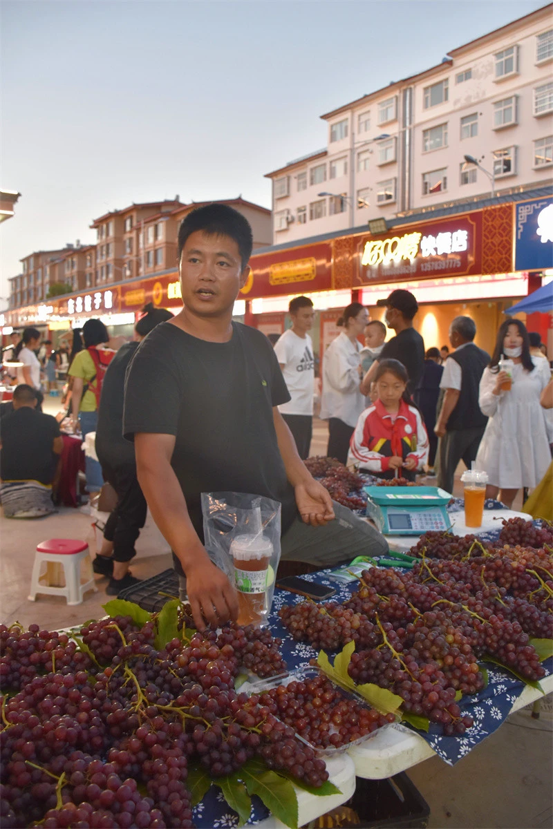 在嘉和夜市,叫卖声最响亮、生意最好的要数售卖葡萄的宋老板了。“来来来!瞧一瞧,看一看,好吃又脆的新鲜葡萄只要10元一袋啦!”据宋老板介绍,他家的葡萄叫“玻璃脆”,皮薄多汁脆爽无籽,从大理宾川专门拉过来售卖的,丽江很多市场以及超市都跟他们家进货。“这是我们家自己在宾川种的葡萄,在这里摆摊一天收入一千多元,我家葡萄好吃,买的人自然多。”