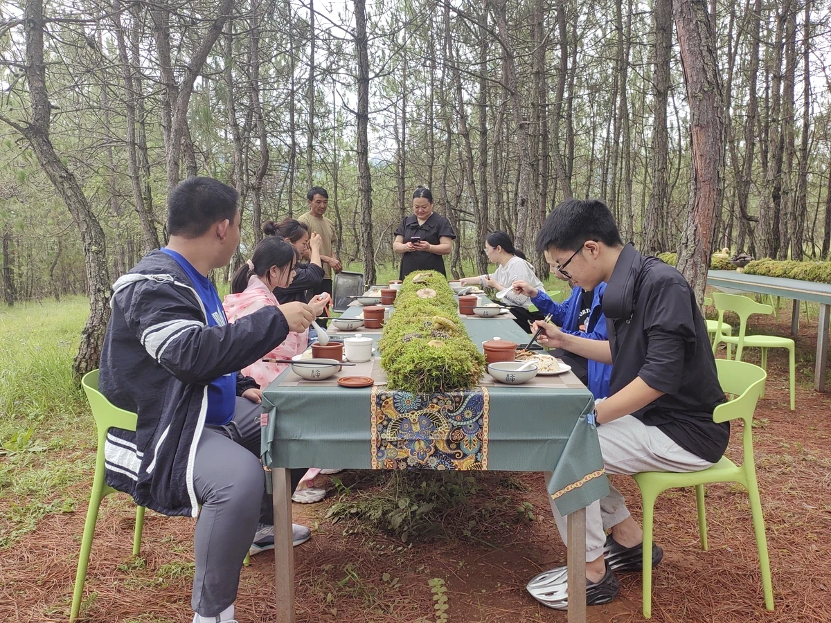 游客们在森林里享用午餐。(丽江融媒记者 赵丽军 摄)