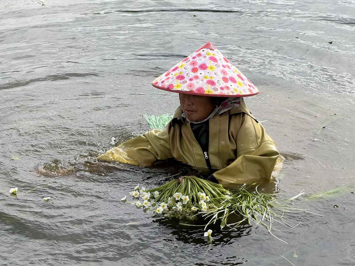 村民们在采收海菜花。(丽江融媒记者 钱磊 摄)