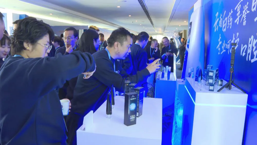 嘉宾在参观云南白药新产品。(丽江融媒记者 张丽瑶 摄)