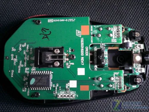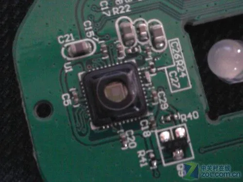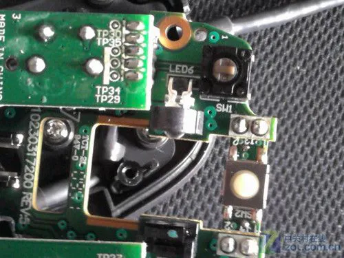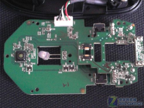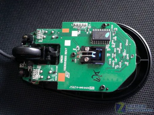 相信看到这里,各位读者肯定等的也心焦了,那好我们现来看一下鼠标的核心部分,传说中的“蓝影”光学引擎及鼠标的电路设计。由于“蓝影”光学引擎的特殊性,Comfort Mouse 4500采用了两块电路板设计,前电路板是微动及滚轮部分,后半部电路板上承载着“蓝影”引擎及MCU等核心元件。
