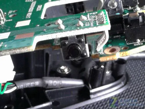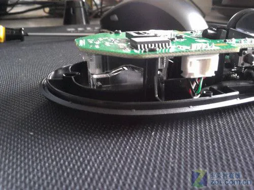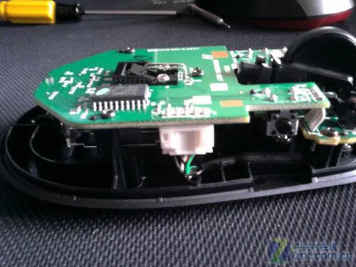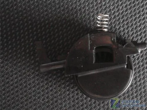 因为是左右滚轮,所以相比IE3.0的那种结构略为复杂。滚轮尾部有一个拨块用来触发左右滚动微动,滚轮下部有一个小弹簧用来加大中键触发压力来减小进行滚轮左右摆动时的误操作。取下滚轮,松开全部螺丝后,就可以取下电路板了,不过滚轮尽管是夹卡固定的,但是拆下来也颇费些功夫。