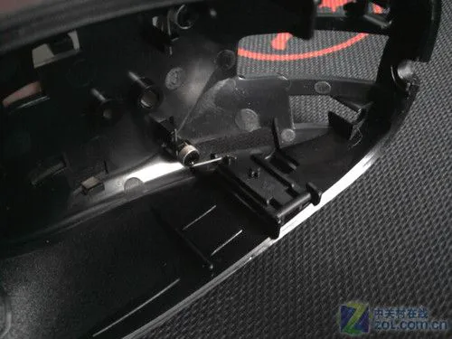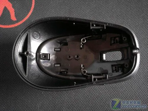微软蓝影4500鼠标底部螺丝卸下后,因为鼠标上部没有电路板排线等,直接就是上盖底盘两部分,设计简洁利落。结构类似于传统的IE3式但有所不同,为防止出现侧键松垮的现象,特意在两个侧键处多加上了两个扭簧,用于侧键回位。因为加入了扭簧,所以侧键和上盖连接的地方不是像IE3.0那种卡式靠侧键零件本身塑性回弹的回位的设计,而是直接做成了转轴合页式的设计。